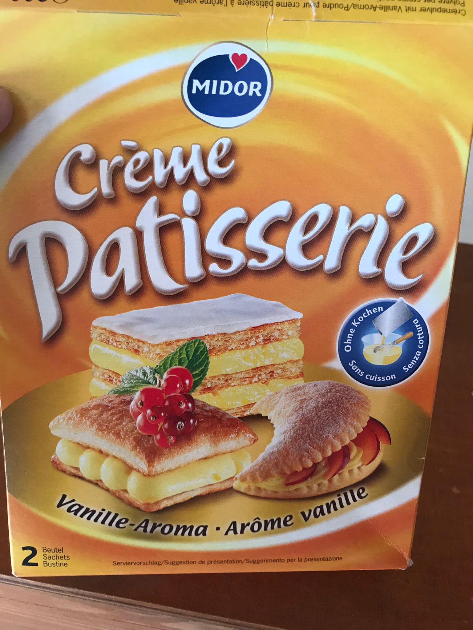 - In einem separatem Behälter: mische das Puder “Crème Patisserie” (siehe Bild oben) mit 200ml Wasser & Kirsch ODER Rhum.