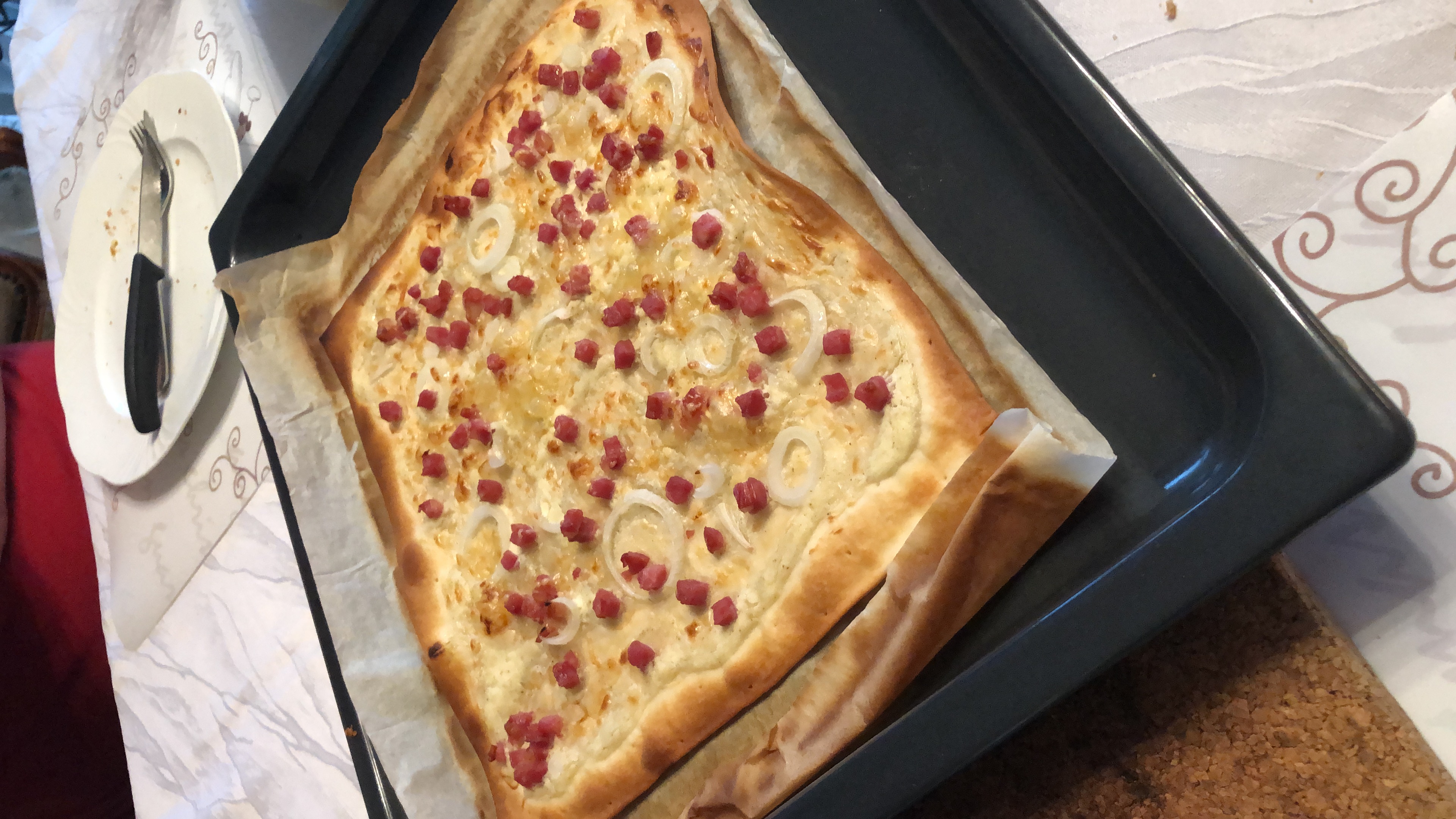 - Flammkuchen (= Speck + Crème-Fraîche + Zwiebeln)