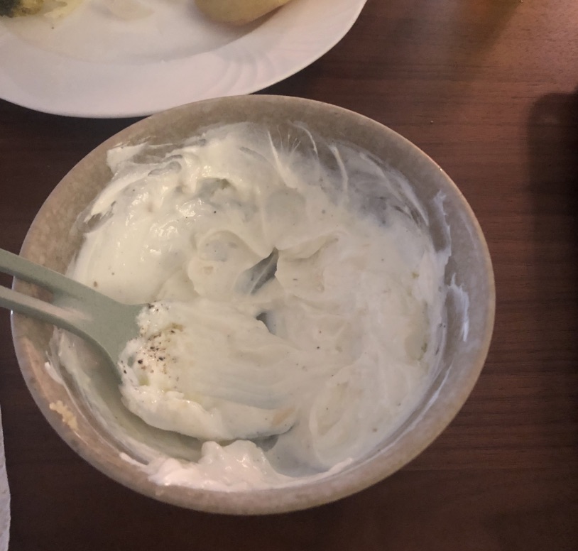 - Zubereitung: Vermische ca. 150–200 g Skyr (isländischer, sehr fettarmer Nature-Joghurt) mit 1–2 gepressten Knoblauchzehen.